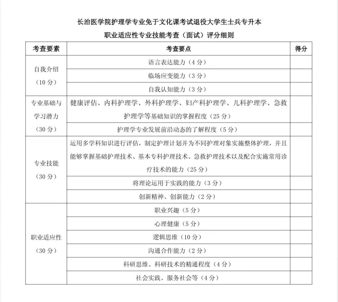 1.《长治医学院2025年专升本免于文化课考试退役大学生士兵职业技能综合考查细则及评分标准》