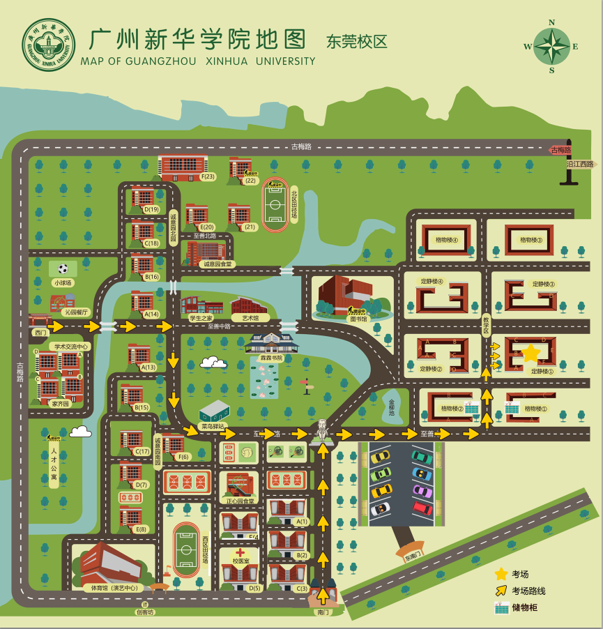(一)考试当天,请考生规划好出行线路,选择合理出行方式,提前到达我校考点。请于广州新华学院(东莞校区)西门或者南门步行进入考点,考生车辆不得入校。