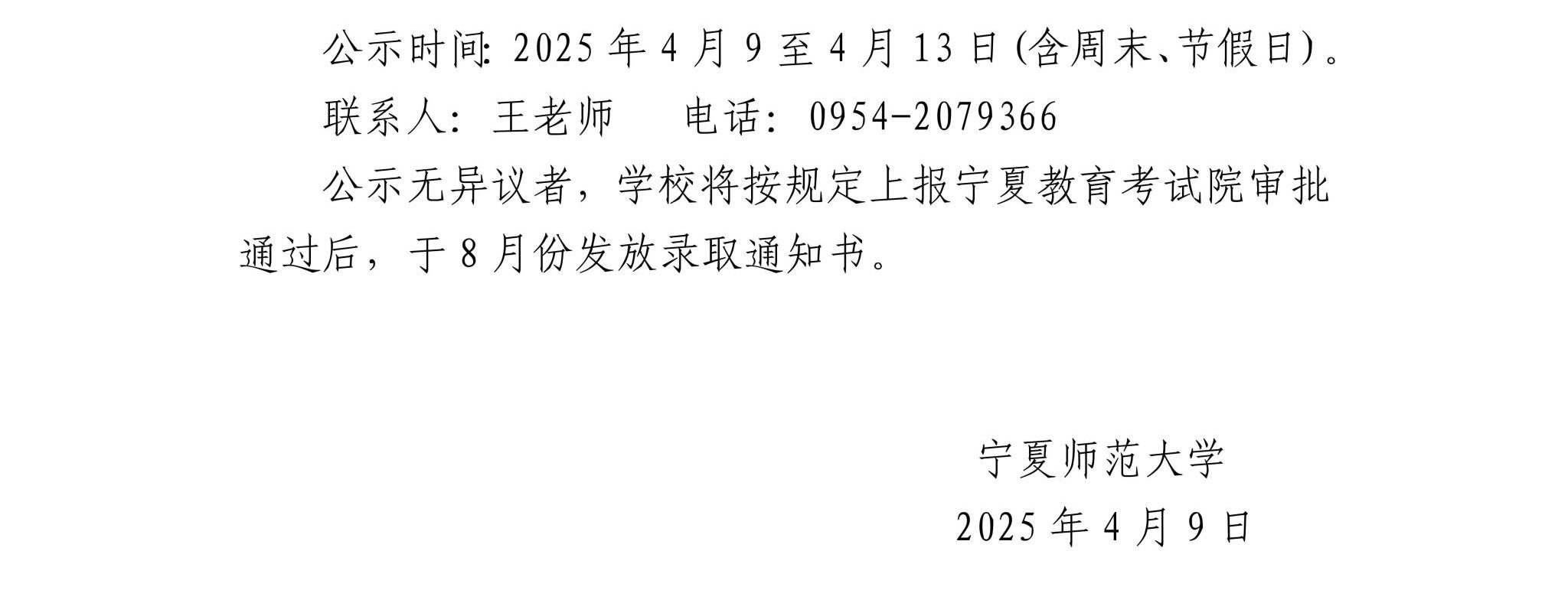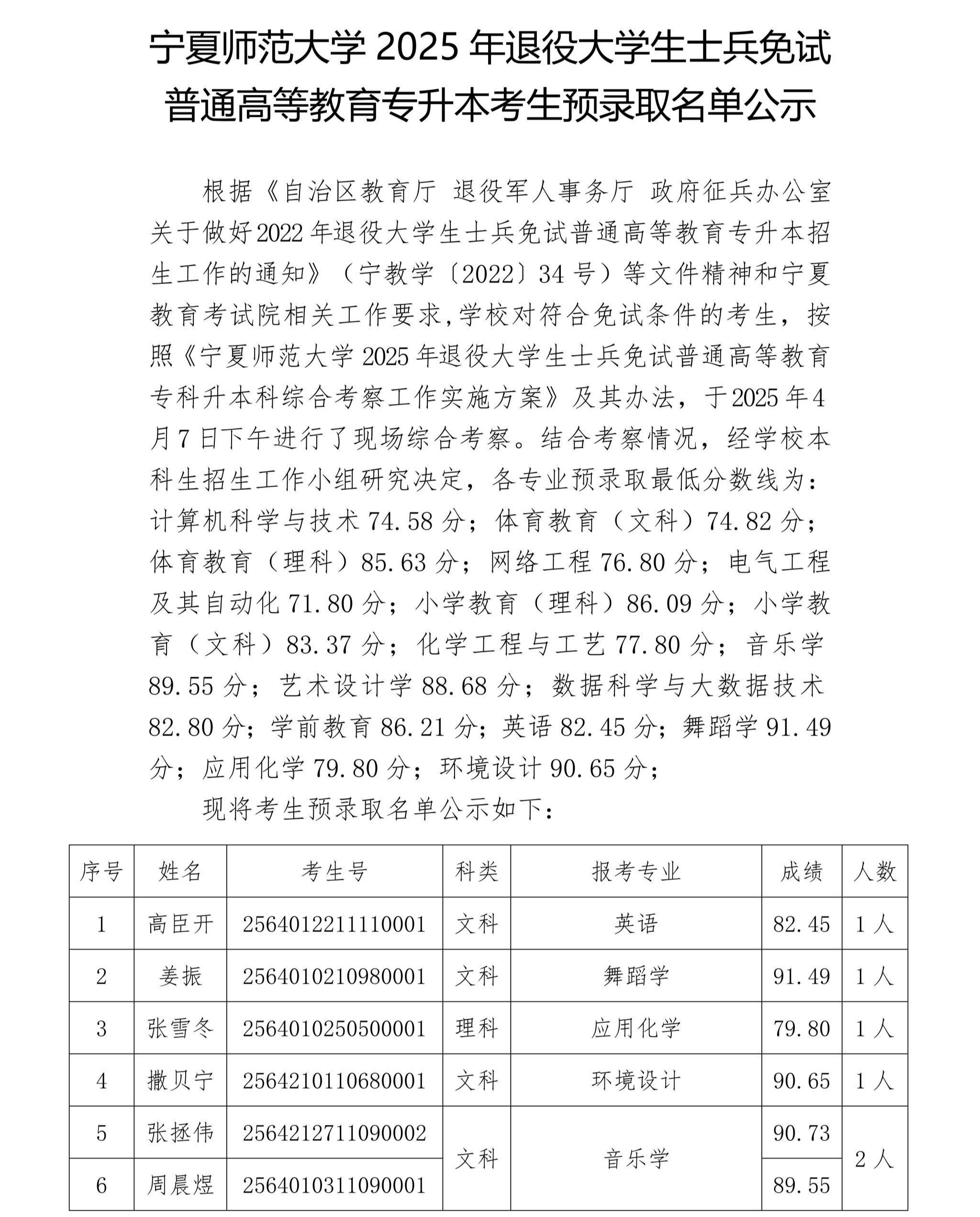 宁夏师范大学2025年退役大学生士兵免试普通高等教育专升本考生预录取名单公示