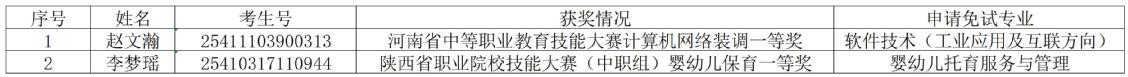 根据《洛阳职业技术学院2025年单独考试招生章程》,经考生申请、报教育厅审核备案,2名考生符合技能拔尖人才免试入学条件,现将备案结果予以公示。公示期:2025年4月9日-4月11日监督电话:0379-63189387
