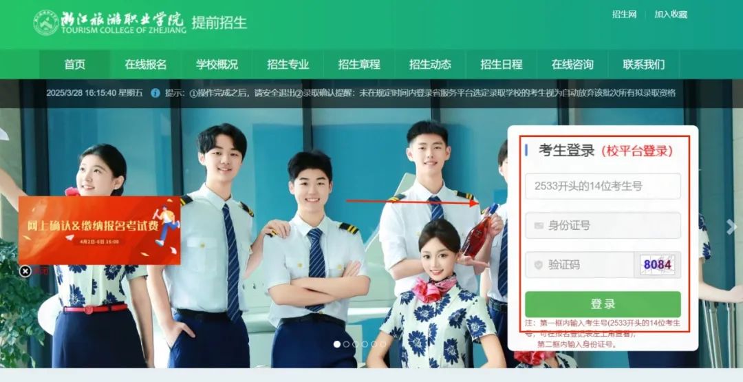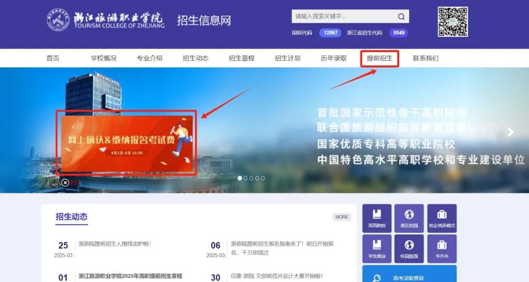 进入浙江旅游职业学院招生信息网后,点击“提前招生系统”浮动图标或“提前招生”栏,再登录考生个人账号。