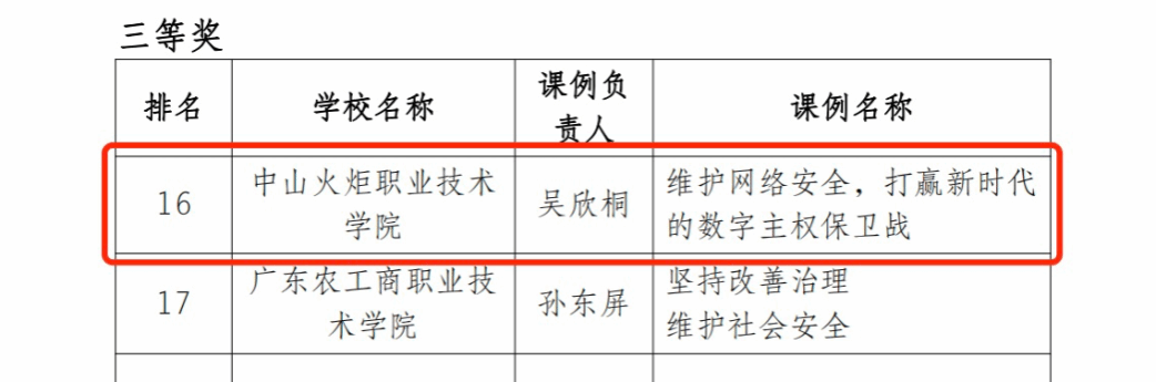 近日,广东省教育厅公布了全省高等院校国家安全教育优质课例获奖情况。我校马克思主义学院报送的两门课例《筑牢“科技安全”防线,护航“制造强国”》《维护网络安全,打赢新时代的数字主权保卫战》分别荣获二等奖、三等奖,双项殊荣彰显我校思政课建设又取得新成效。
