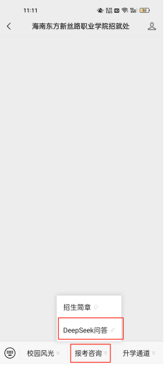 关注后可进入到“【海南东方新丝路职业学院招就处】”微信公众号主页,点击底栏“报考咨询”菜单栏的“Deepseek问答”即可在线咨询。移动端招生咨询平台问答页同时支持语音提问。