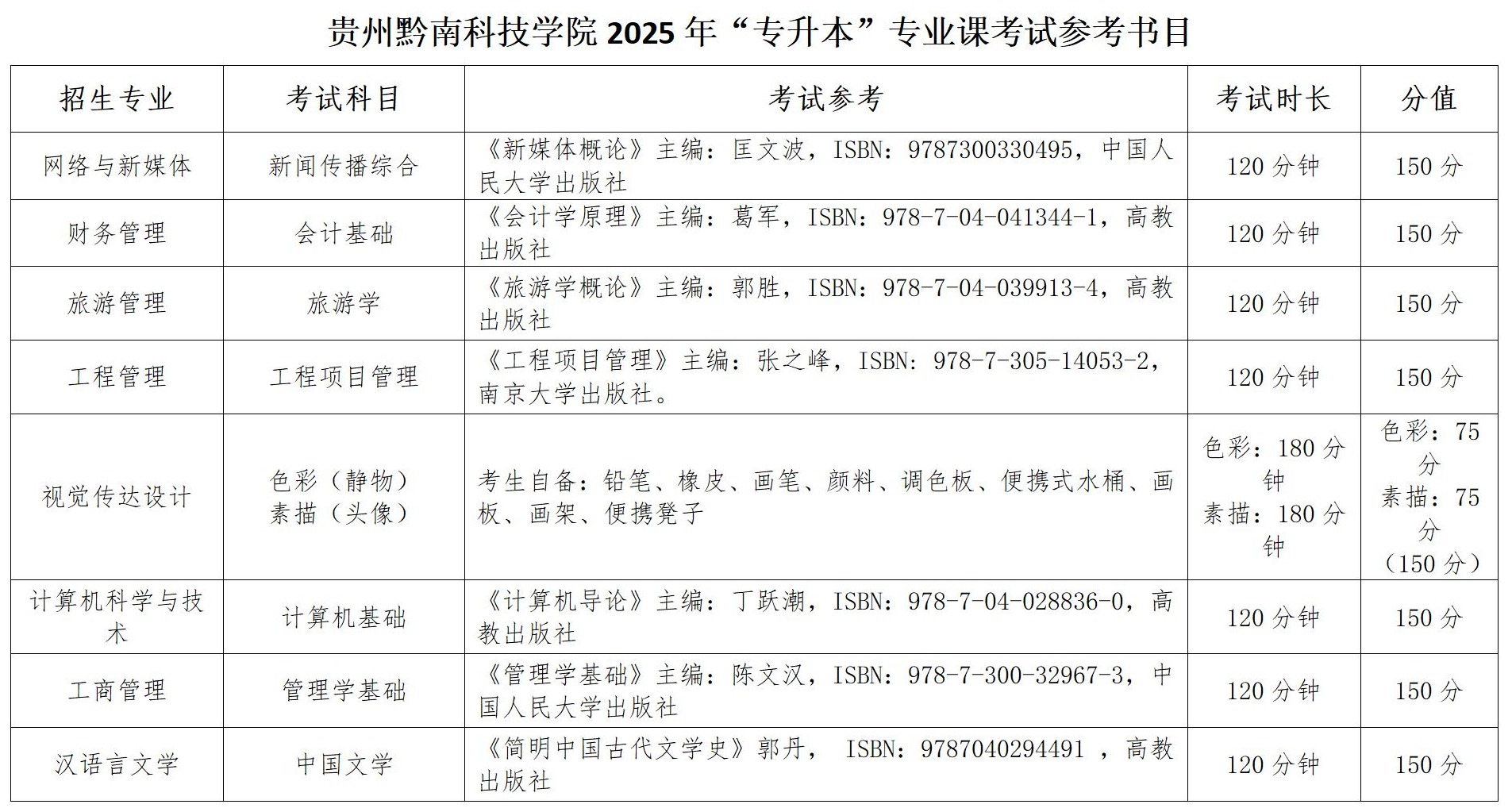 贵州黔南科技学院2025年“专升本”专业课考试参考书目