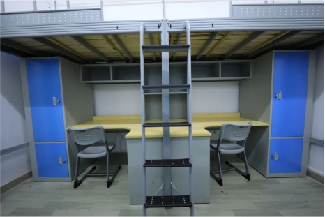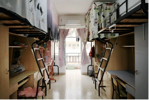 明德区宿舍楼,以四人单间为主,上床下桌,有洗漱间、阳台、卫生间,所有宿舍都已安装空调,宿舍内安装有电热水器,可以24小时提供热水服务。