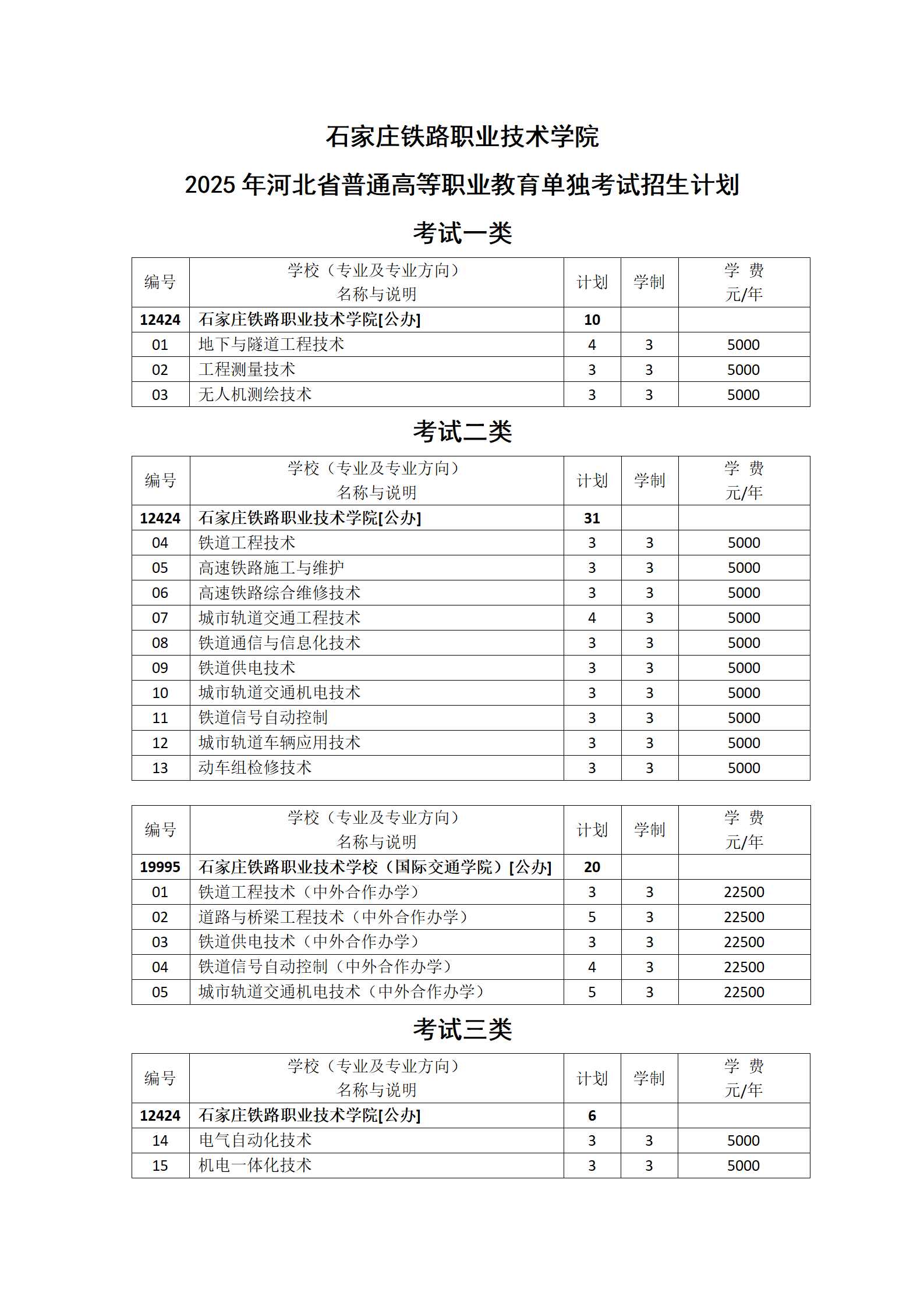 石家庄铁路职业技术学院2025年河北省普通高等职业教育单独考试招生计划