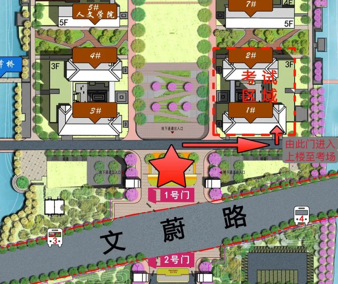 考生从宁大科院1号门(文蔚路)进校,至公共教学楼1号楼东南门处进入对应考场。