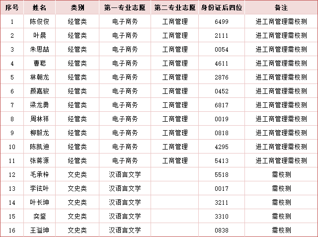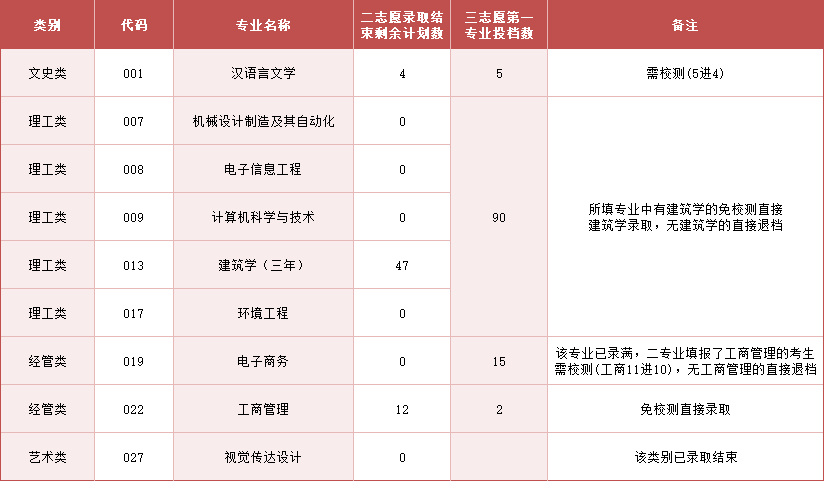 经管类第一专业志愿填报工商管理的考生、理工类有专业志愿填报建筑学的考生,因本轮投档的考生数少于对应招生专业志愿的剩余计划数,免综合测试,直接予以录取,无需参加本轮综合测试。其余专业志愿均已录满将直接退档。