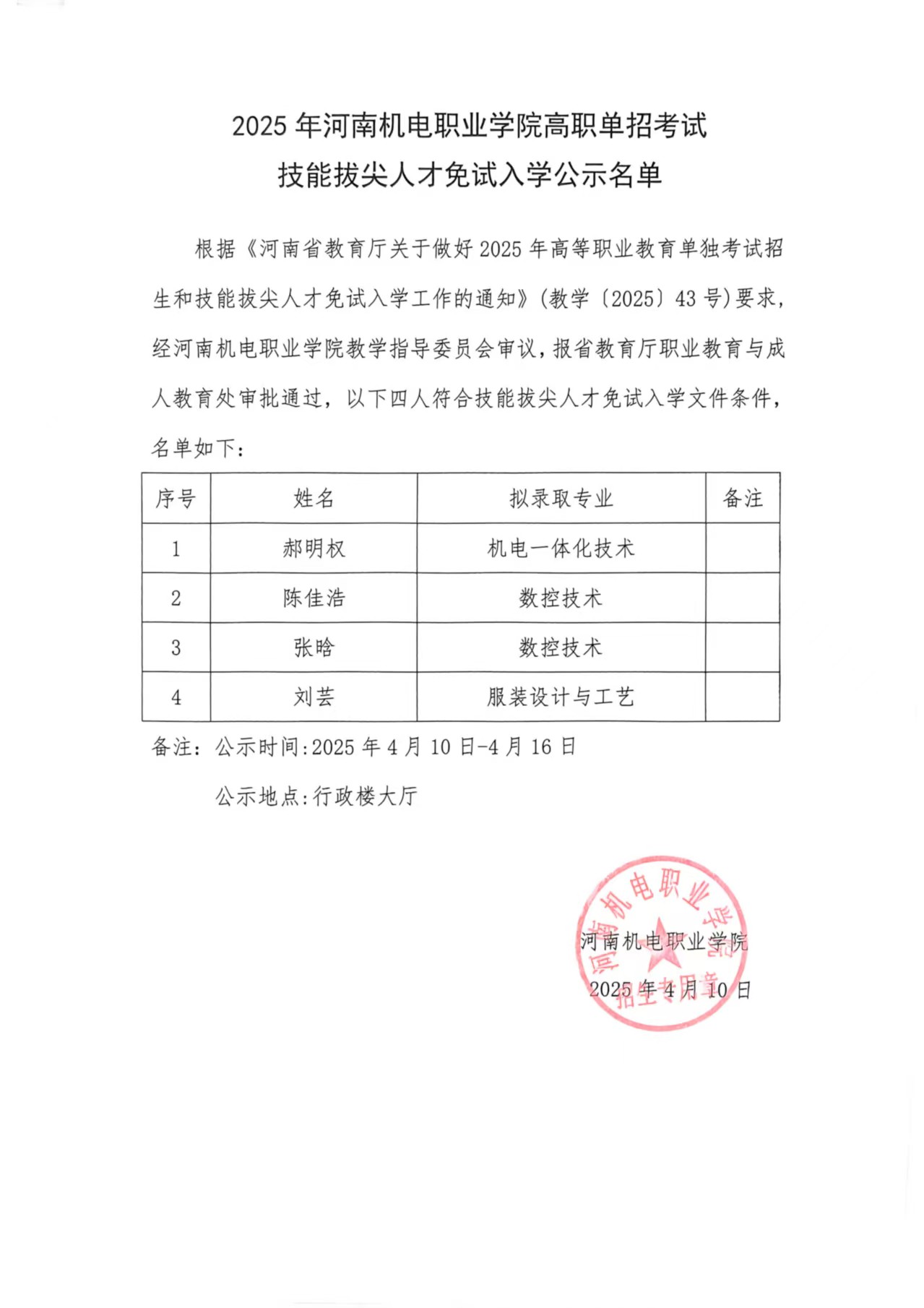 2025年我校高职单招考试技能拔尖人才免试入学公示名单