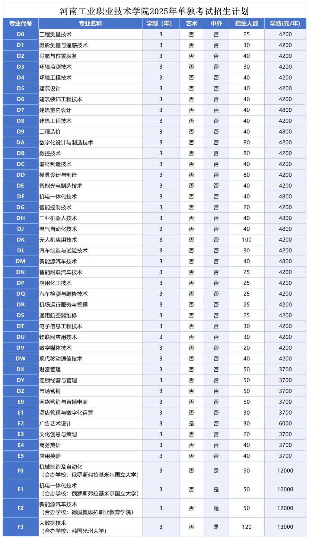 河南工业职业技术学院2025年单独考试招生计划