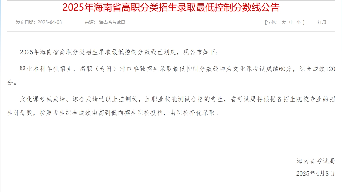 2025年海南省高职分类招生录取最低控制分数线公告