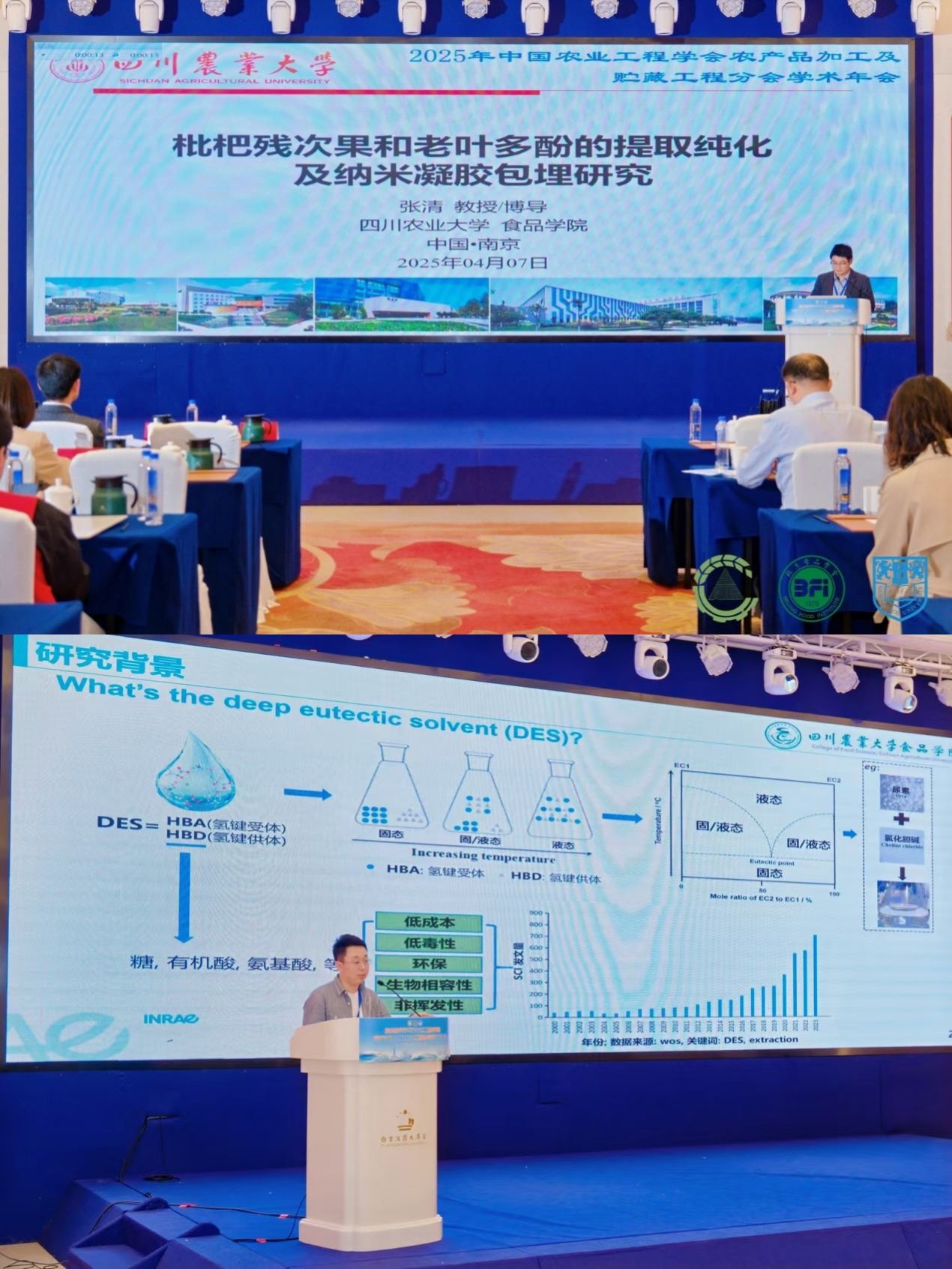 张清、陈明睿分别在“产品贮藏保鲜与生物技术”与“农产品初/精深加工技术及装备”分会场做了“枇杷残次果和老叶多酚的提取纯化及纳米凝胶包埋研究”和“基于天然低共熔溶剂预处理的苹果渣果胶梯次生物精炼”的汇报。
