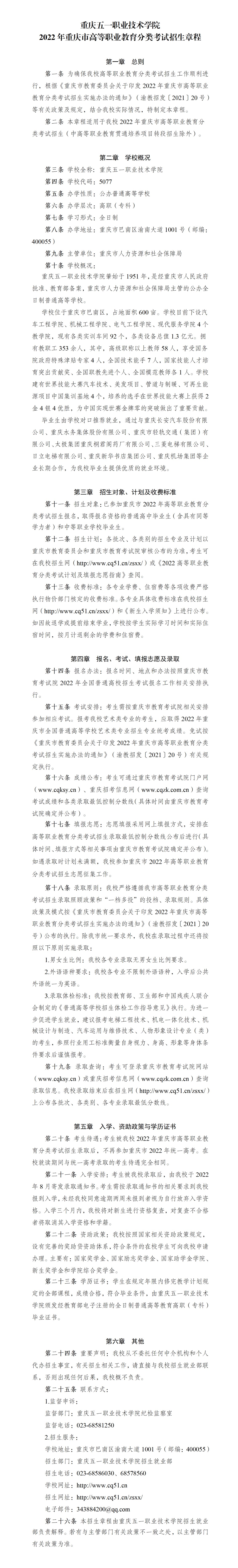 重庆五一职业技术学院2022年重庆市高等职业教育分类考试招生章程
