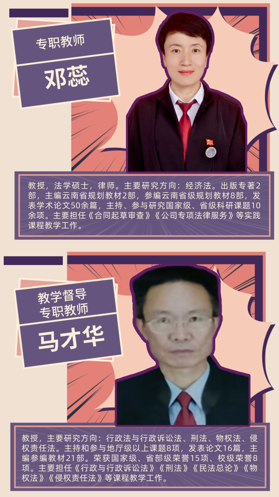 法学专业是省级一流本科专业建设点,是云南省高等学校法学本科专业高素质应用型人才培养模式创新实验区。构建以“学徒制”应用型卓越法治人才培养、诉前调解“个十百千万”工程等项目为代表的“四位一体”产学合作协同育人机制,荣获云南省教学成果奖二等奖及优秀教学团队。开设了法学+纪检监察人才和应用型卓越涉外法治人才2类实验班。