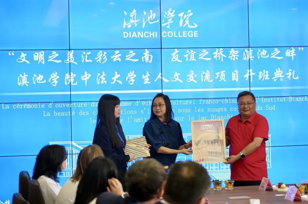 典礼尾声,双方互赠象征文化交融的礼物——滇池学院送上“高山流水知音同行”书法作品,对方回赠阿尔图瓦大学校园艺术工艺品。