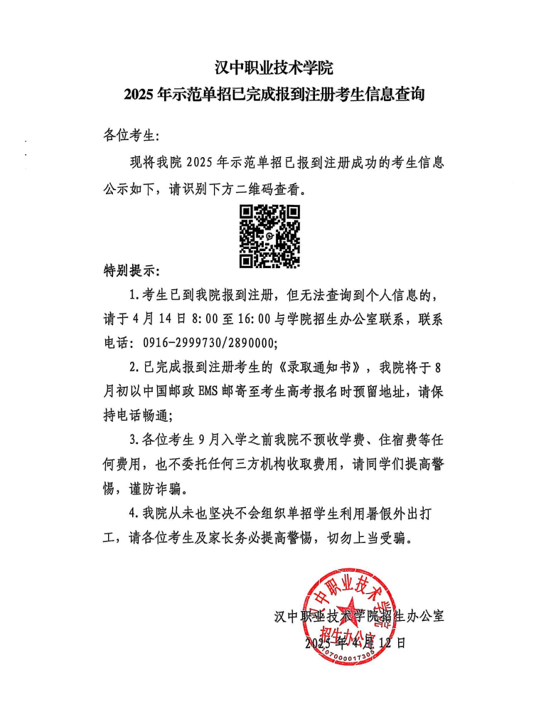 汉中职业技术学院 2025年示范单招已完成报到注册考生信息查询
