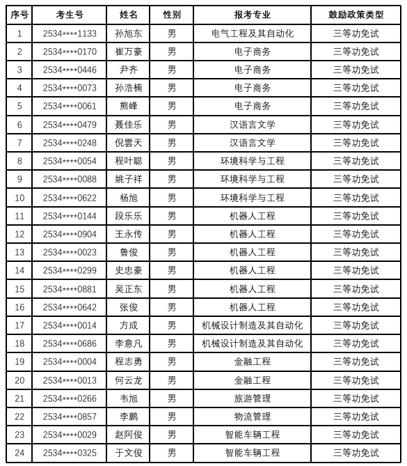 根据《皖西学院2025年普通高校专升本招生章程》等相关文件规定,经本人申请、学校审核,孙旭东等24名退役士兵具备三等功免试资格,现公示如下: