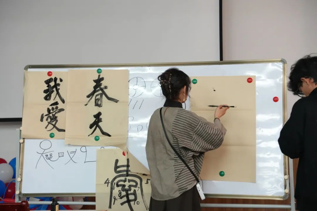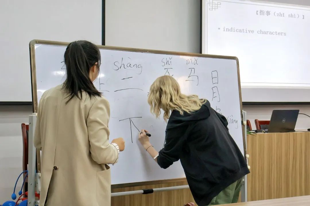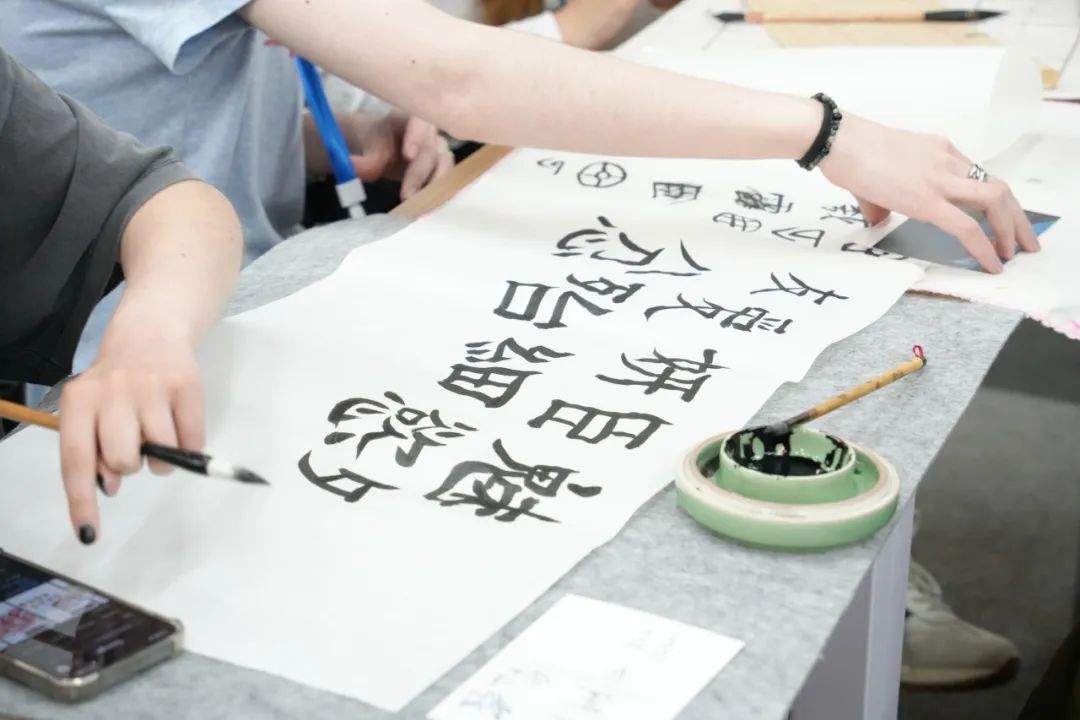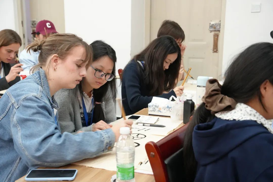 书法课程体验环节。在专业老师的指导下,同学们手握毛笔,从最基本的笔画开始练习。中国学生手把手教法国同学握笔姿势,老师在讲台上进行书法教学,墨香弥漫的教室里,中法学生共同书写着横竖撇捺,构成了一幅文化交融的生动画面。