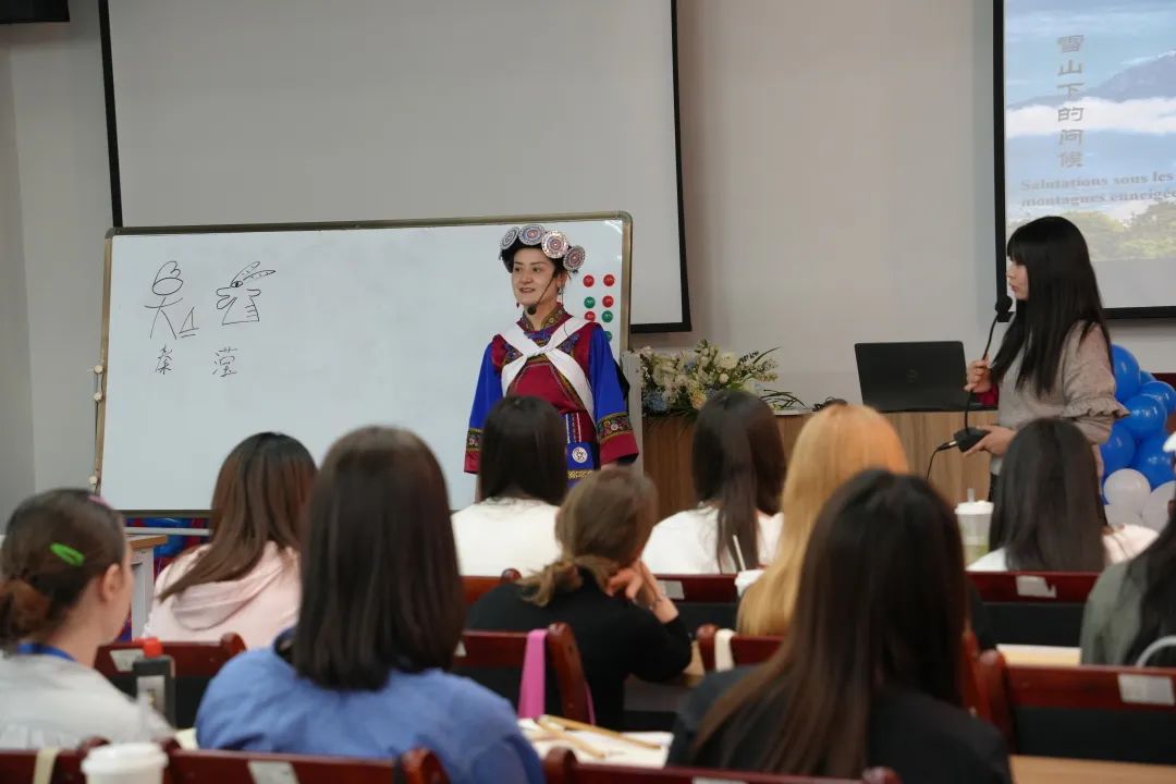 老师身着纳西族民族服饰走进教室与同学们见面,向同学们介绍了纳西族的东巴文化并展示了东巴手工纸,通过独特的触感让中法学生近距离感受到中华传统民族文化的魅力,还让大家感受到了纳西语言的魅力。