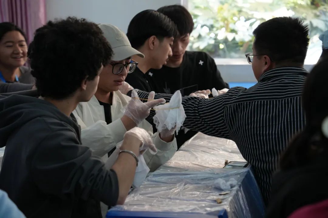 在授课老师的示范下,学生将白布通过捆扎、折叠、夹板等方式将自己制作的扎染作品塑形,浸入靓蓝染缸,体验大理白族扎染技艺,让大家感受到了中国传统手工艺的智慧与浪漫。