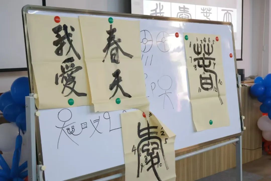 老师带领同学们走进了神秘的古代汉语世界。通过投影展示了甲骨文字,中法学生共同了解了"日"、"月"、"人"等生动的象形文字。
