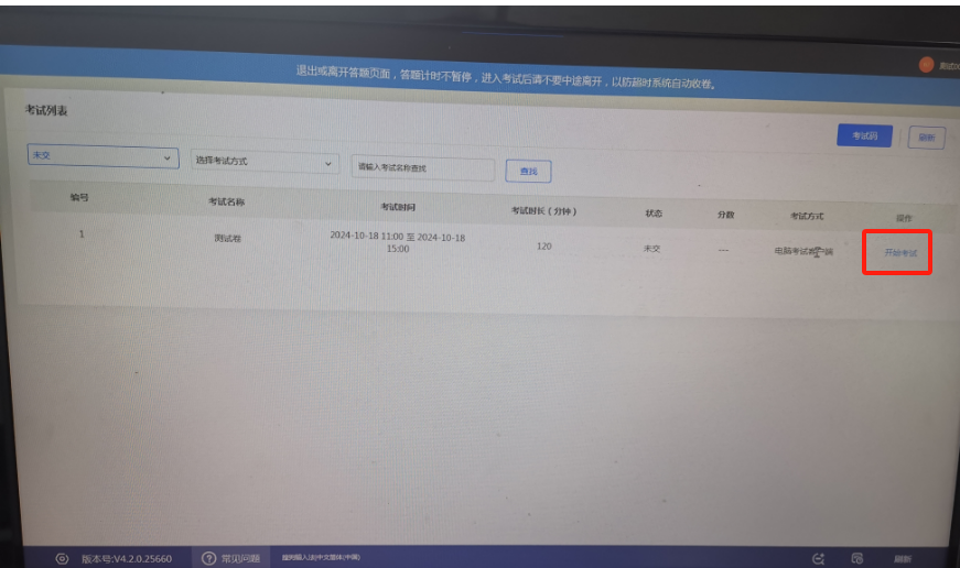 4.登录成功后,在考试列表界面,找到相应的考试名称,点击该场考试最右边的“开始考试”。