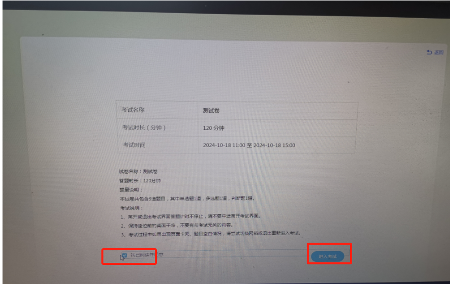 点击待考区界面下方的“我已阅读并同意选项框”,点击“进入考试按钮”即可进入考试。