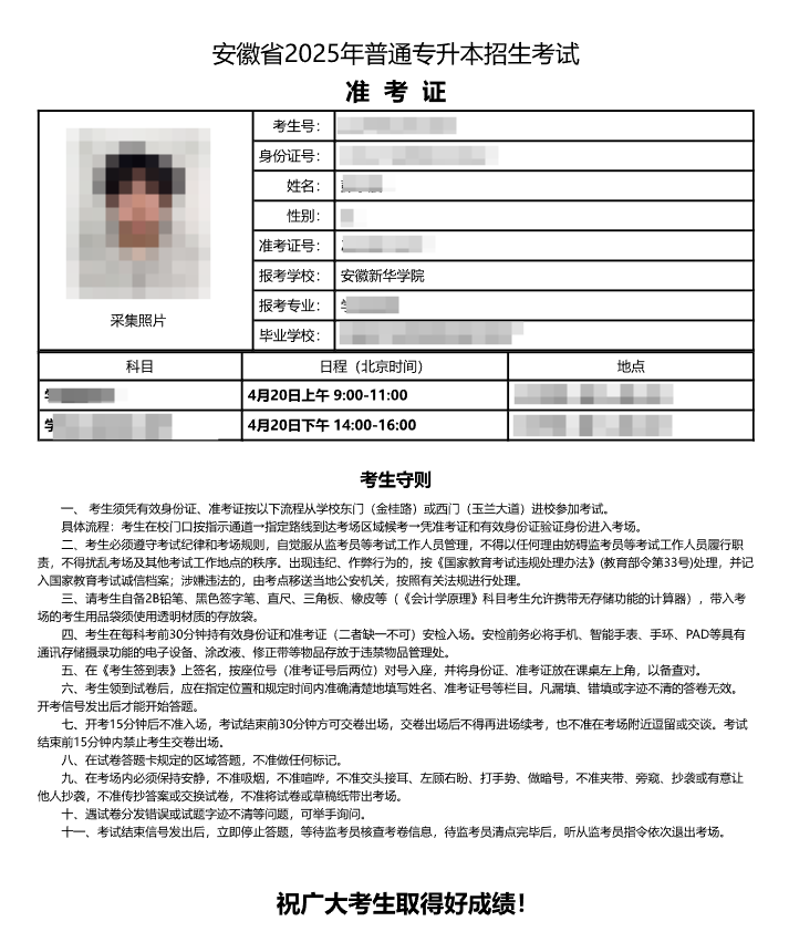 安徽新华学院2025年普通专升本招生考试准考证打印开始时间为4月15日10:00,具体操作流程如下: