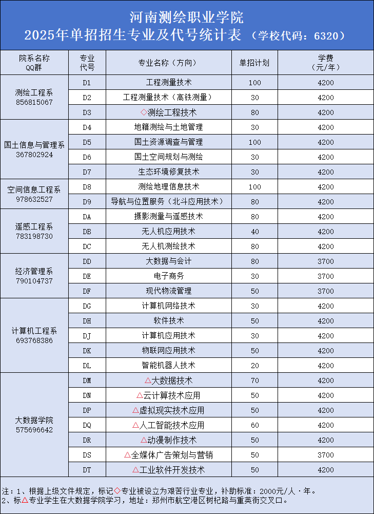 河南测绘职业学院2025年单招招生专业及代号统计表