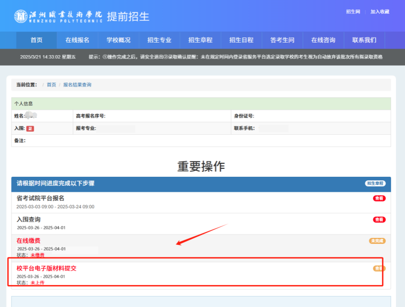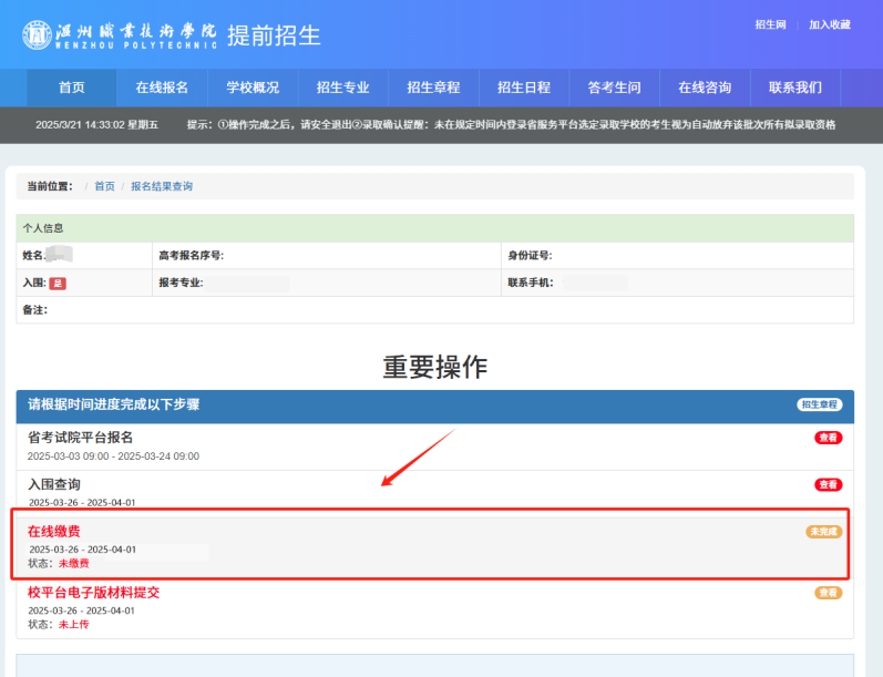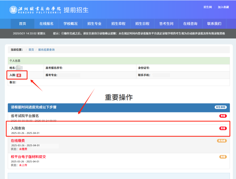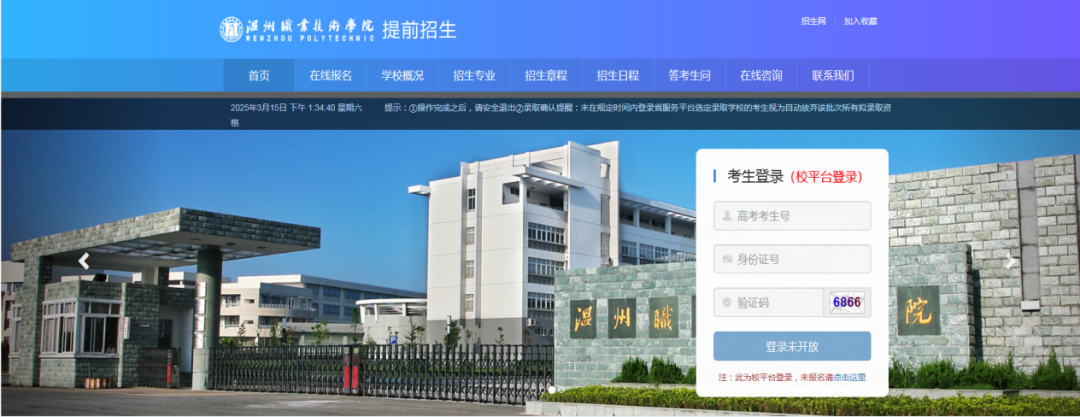 考生可于2025年3月26日登录我校提前招生网(https://tqzs.wzvtc.cn/)查询,也可以前往学校官网点击浮窗查询,具体查询方法如下: