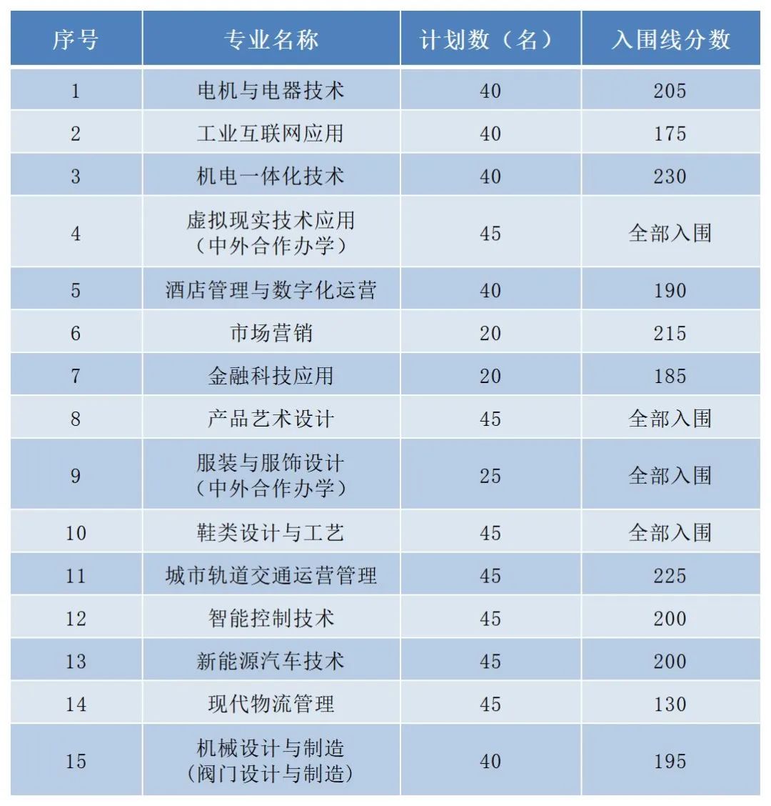 我校2025年提前招生报名已经结束,根据《温州职业技术学院2025年高职提前招生章程》规定,学校已按各专业招生计划数的500%确定综合素质测试入围考生名单(若报考人数未达到该专业招生计划数的500%,则符合该专业报考条件的考生均入围综合素质测试;若某一专业入围资格线出现多名考生总分相同则一并入围)。现将入围分数线、入围查询及缴费等有关事项公告如下: