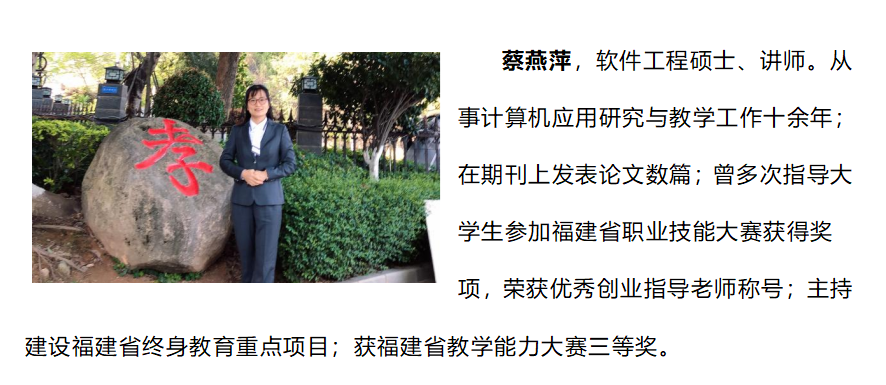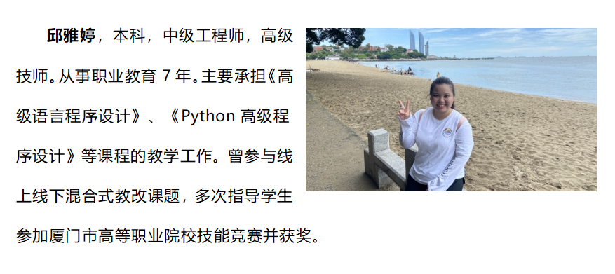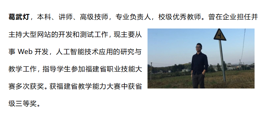 专业现有专职教师18名,产业导师8人。其中,专职教师中副教授职称3名,占比约17%;讲师12名,占比67%;“双师型”教师16名,占比约89%;硕士7名,占比约39%。一名老师入选厦门市科技专家库专家。
