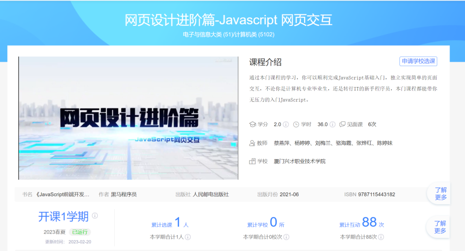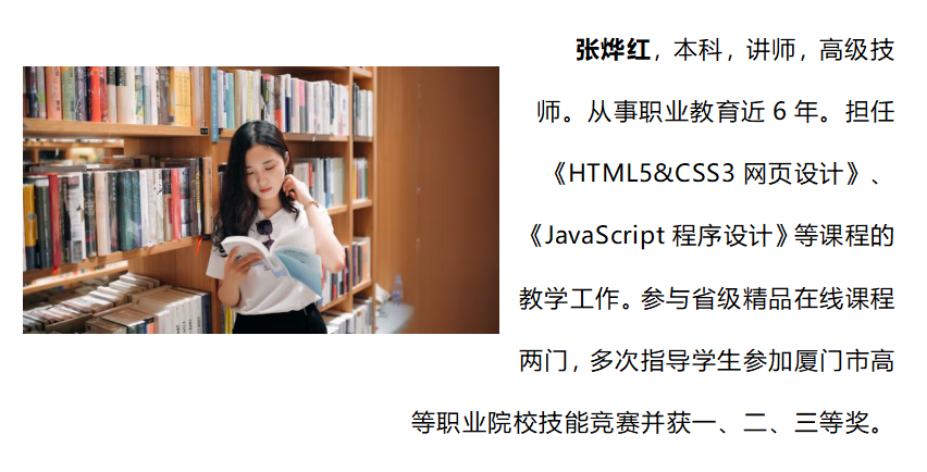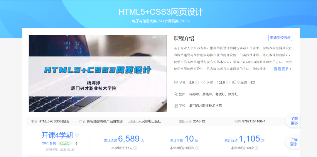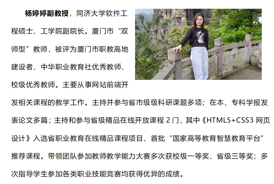 组建校企双元师资团队,开发基于真实工作场景的生产性案例库。重点建设《HTML5+CSS3 网页设计》《JavaScript 网页交互设计》两门省级精品在线开放课程,其中《HTML5+CSS3 网页设计》入选国家高等教育智慧教育平台推荐课程,形成 "线上 + 线下" 混合式教学模式,有效提升教学资源的共享性与时效性。