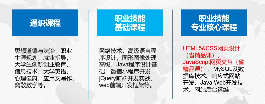 本专业采用“理实一体、项目贯穿、工学结合、专才多面”四位一体的特色人才培养模式。培养面向互联网、软件与信息服务等行业的Web前端设计、全栈开发、网站运维、网页美工、系统运维、网络数据处理、IT产品销售与支持等职业群,能够从事系统运行维护、网站开发、网络媒体运营、数据处理等工作的高素质技术技能型人才。