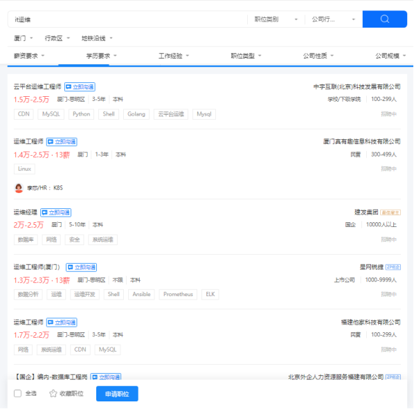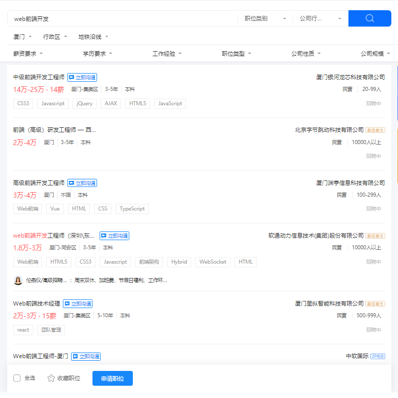 根据智联招聘等多个招聘平台数据显示,2024 年对于 Web 前端工程师人员的缺口将达到几十万之多。目前,北京、上海、广州、深圳等地 web 前端工程师的薪资待遇更是一飙再飙。来看看 2024 年厦门市前端和IT设备运维岗位需求招聘信息: