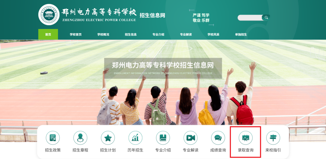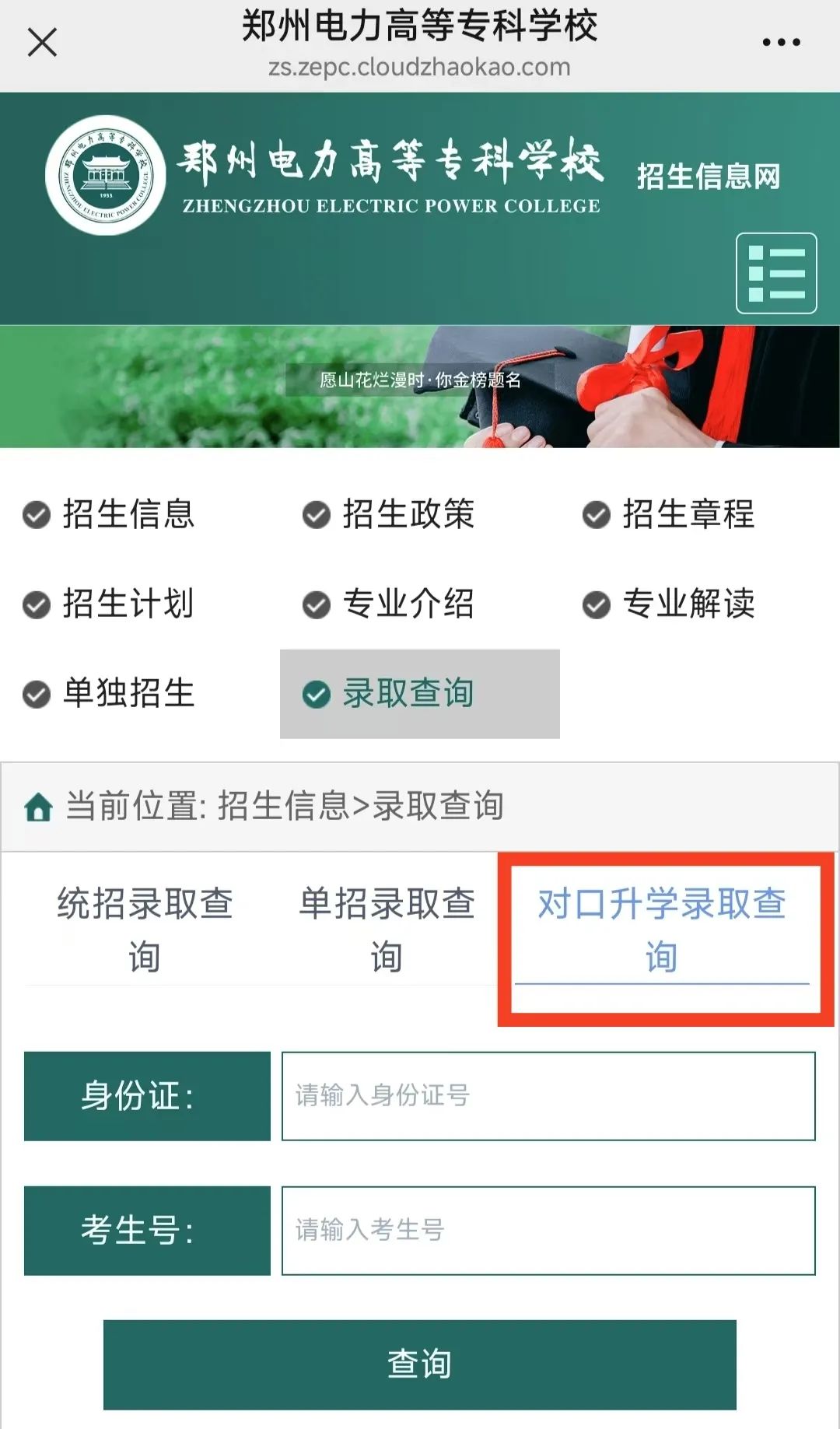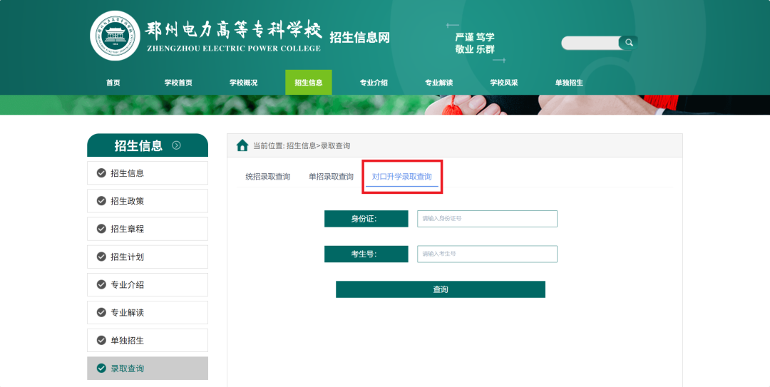 进入郑州电力高等专科学校招生信息网,点击首页“录取查询-对口升学录取查询”,输入身份证号及考生号查询录取结果。