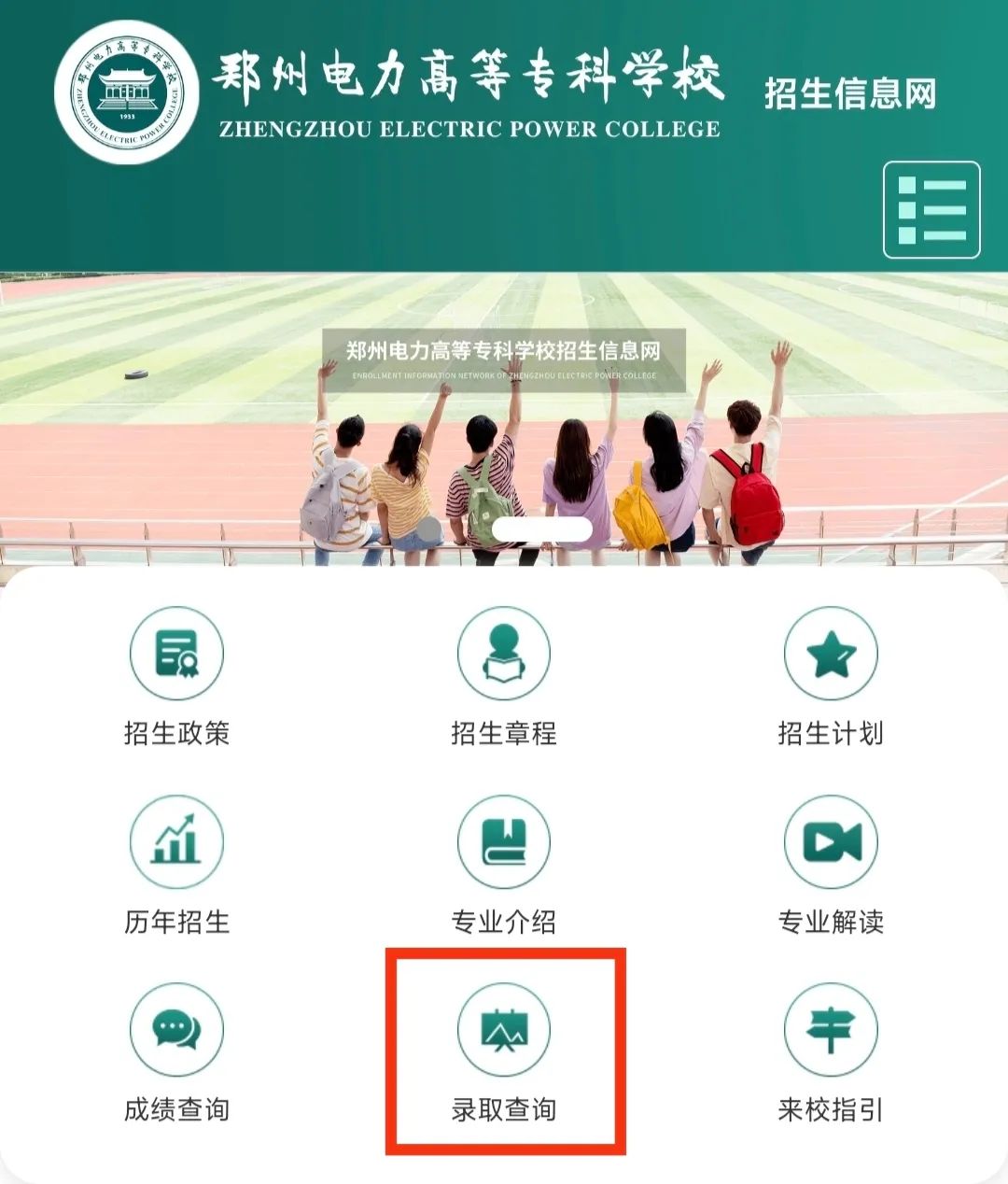 进入“郑州电力高专招生”微信公众号,通过左下方“招生之窗-招生信息网-录取查询-对口升学录取查询”,输入身份证号及考生号查询录取结果。