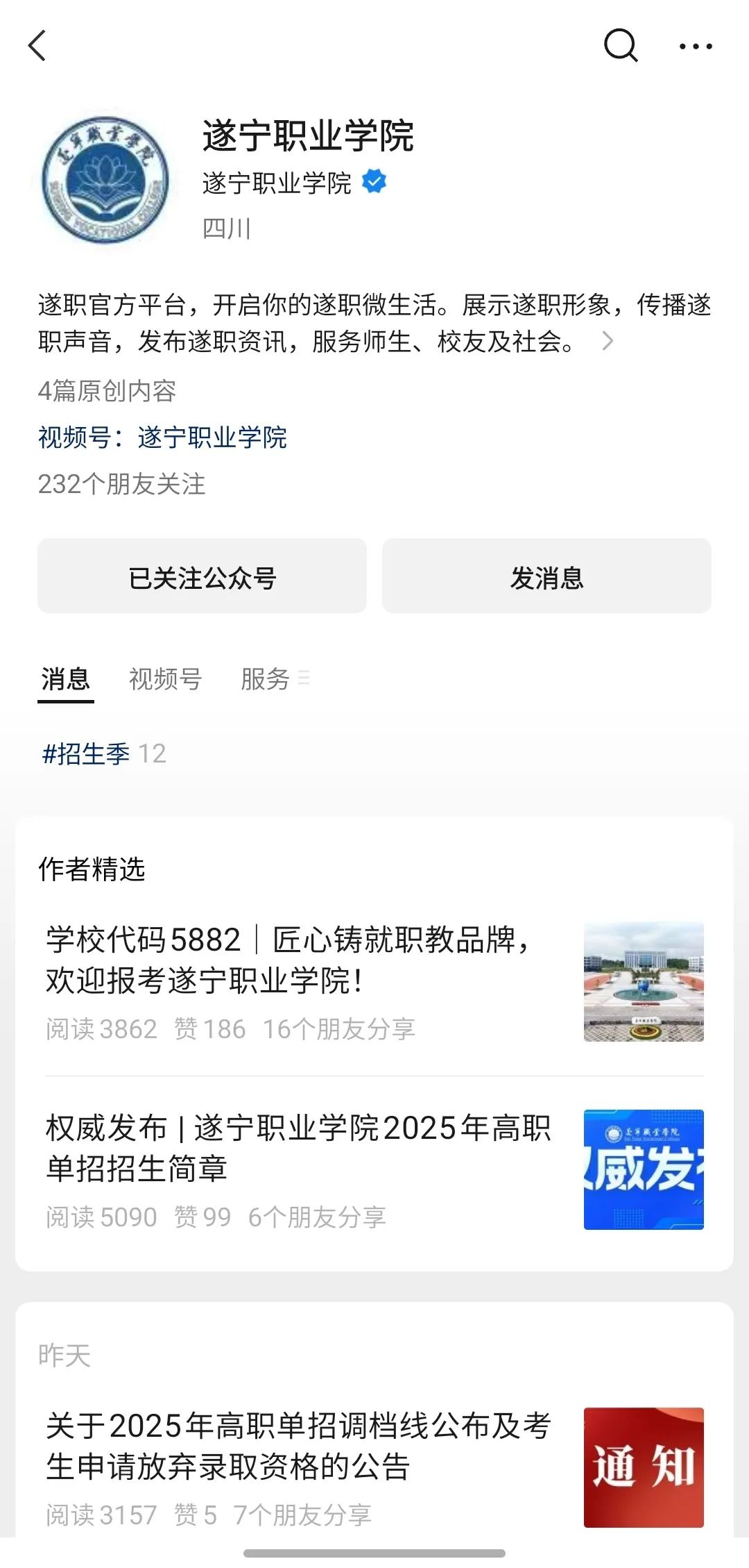 微信搜索"遂宁职业学院"(ID:snzyxy2023)并关注,第一时间获得学校官方信息!
