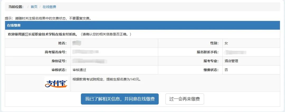 网上确认完成后,根据页面提示用支付宝扫描二维码缴纳报名费140元 /人