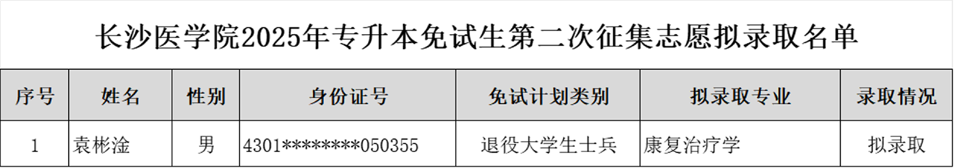 根据湖南省教育厅《关于做好2025年湖南省普通高等学校专升本考试招生工作的通知》(湘教发〔2024〕54号)文件精神,我校组织了免试生第二次征集志愿职业适应性测试并将测试结果上报湖南省教育考试院。经省教育考试院审核通过,现将专升本免试生拟录取名单进行公示,公示时间:2025年4月12日-4月18日,如有异议,请在公示期内与我校联系。
