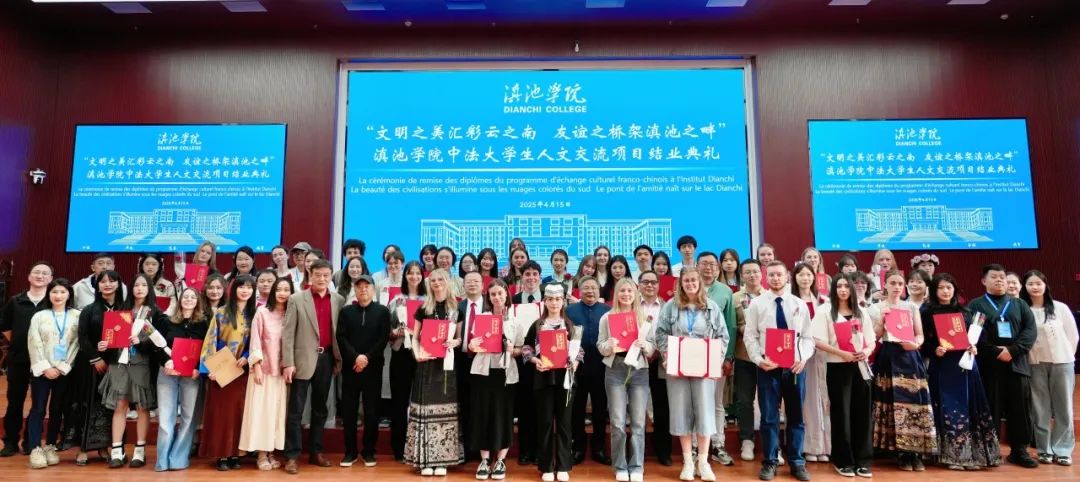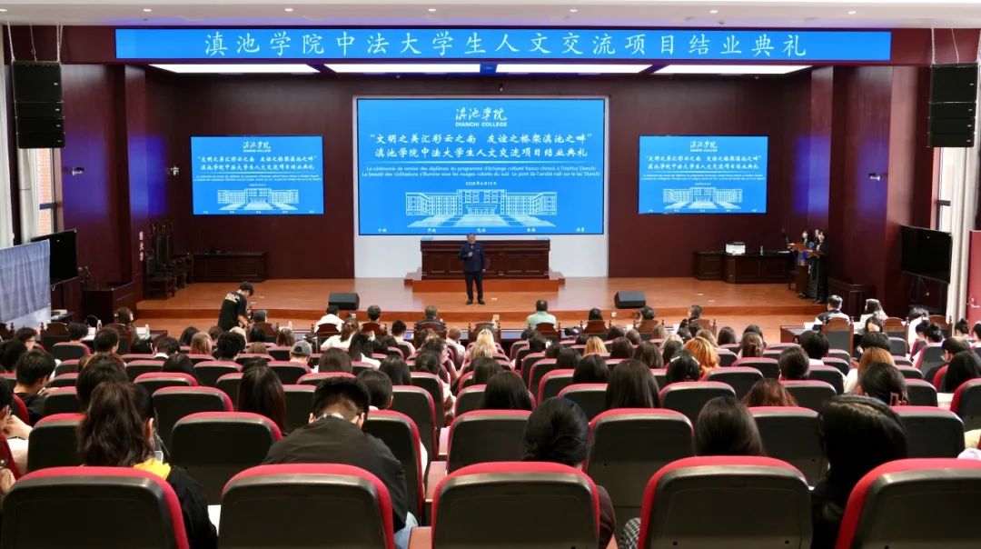 4月15日上午,“文明之美汇彩云之南 友谊之桥架滇池之畔”滇池学院中法大学生人文交流项目结业典礼在滇池学院杨林校区真也堂顺利举办。滇池学院校长马杰、党委书记陈炳灿,副校长向晓明、副校长周沛,人文学院院长宋家宏、体育学院院长秦庆峰、艺术学院院长郭亚非,学生处处长徐东明,外国语学院、人文学院教师代表,法国阿尔图瓦大学27名师生和滇池学院学生代表参加典礼。典礼由法国阿尔图瓦大学胡祎老师和滇池学院国际交流服务中心陈靓老师主持。