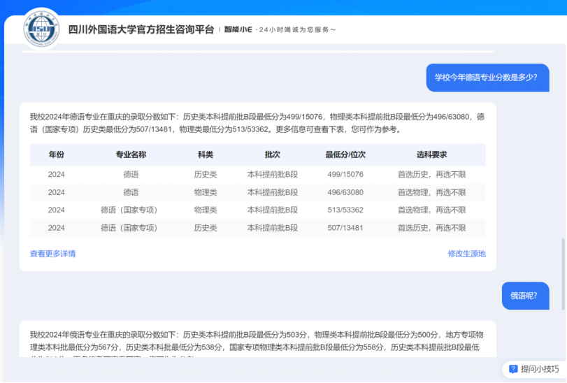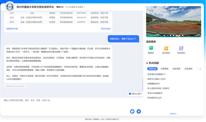 为提升招生咨询服务的智能化水平,四川外国语大学智能招生问答系统正式接入DeepSeek大模型,完成全面升级。此次升级以“更精准、更智能、更温情”为核心,为考生及家长提供更高效、个性化的咨询服务。