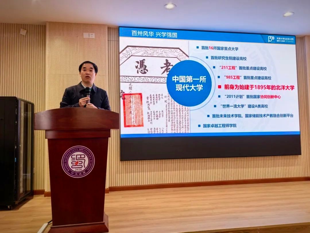 2025年4月2日,天津大学党委常委、副校长李斌赴重庆巴蜀科学城中学招生宣传。李斌与巴蜀科学城中学党委书记赵文平,党委副书记、副校长江文,党委委员、副校长张发强等领导亲切交流座谈,并以“电亮未来—带你了解天津大学”为题,为高二年级400余人作了科普报告。天津大学教务处副处长夏淑倩陪同参加。