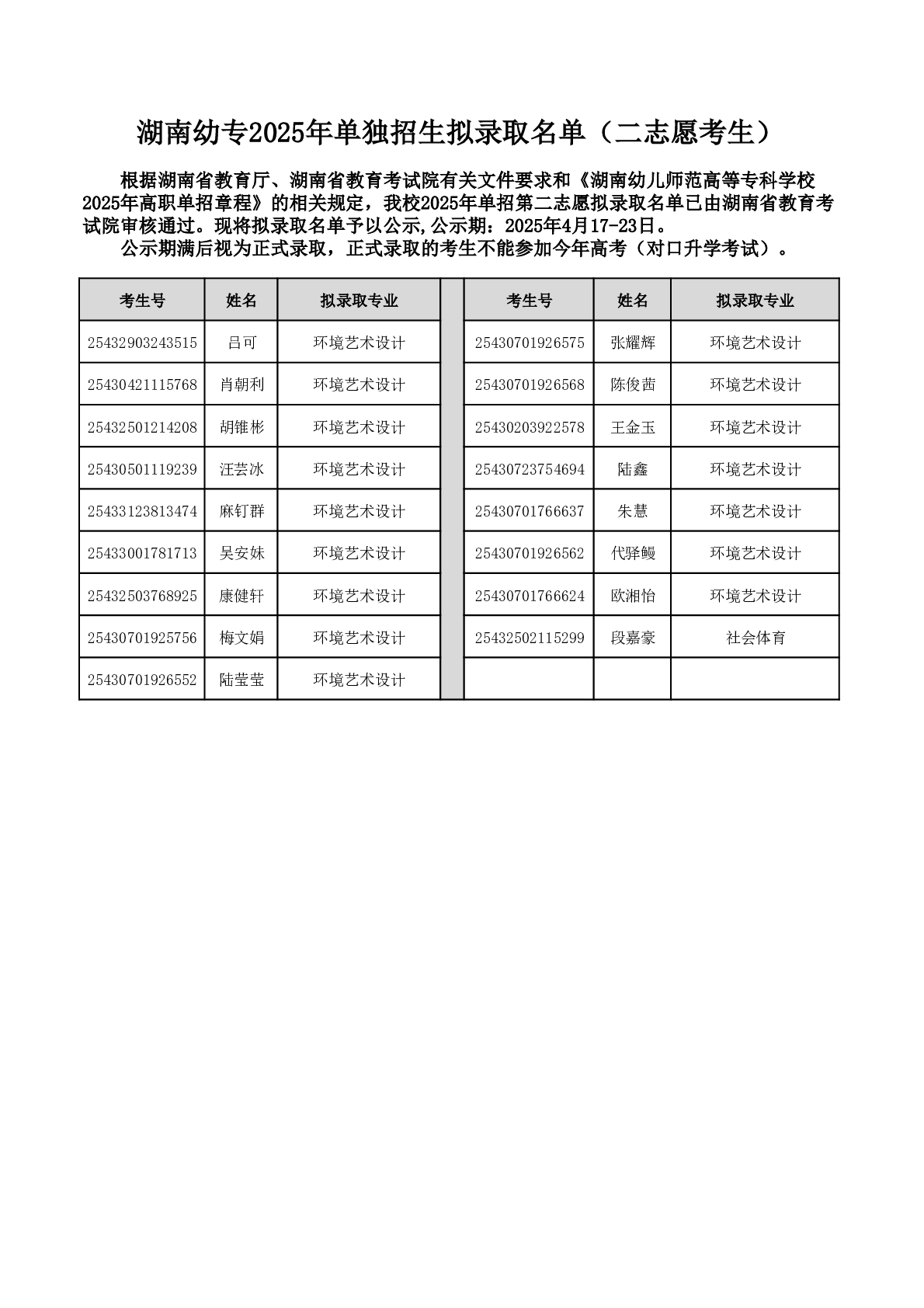 湖南幼专2025年单独招生拟录取名单(二志愿考生)