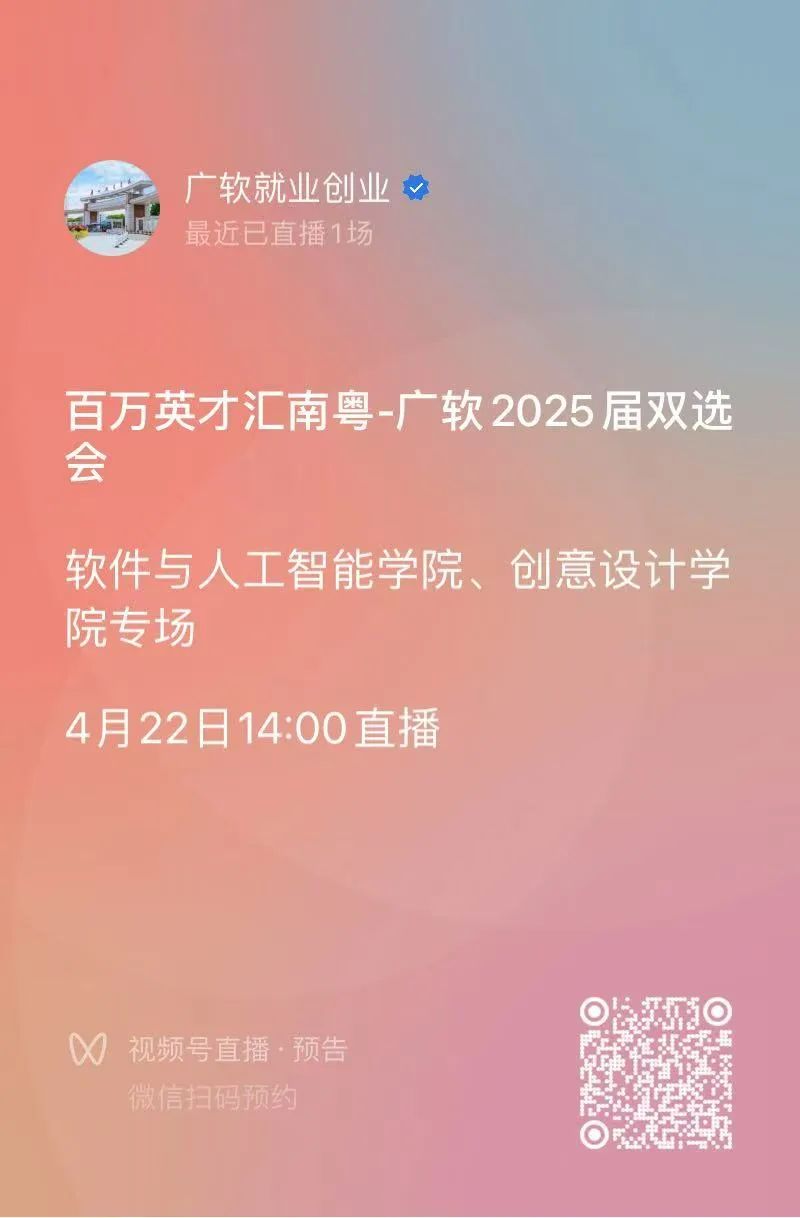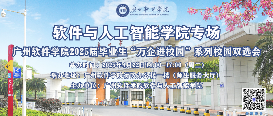 为全面落实党中央、国务院对高校毕业生就业工作的决策部署,推动人才供需精准对接,全力促进高校毕业生高质量充分就业,我校将举办广州软件学院2025届毕业生“万企进校园”系列校园双选会——软件与人工智能学院专场,欢迎各年级同学参加。