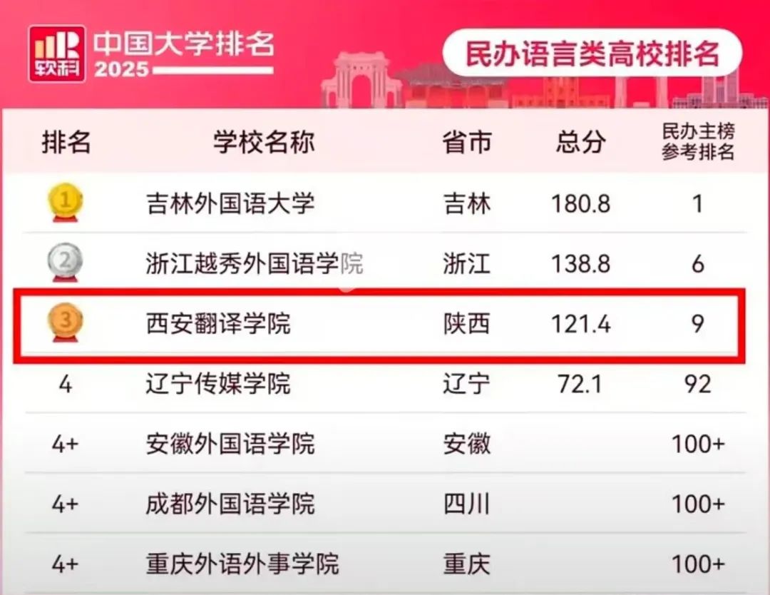 教育部专家曾高度评价西译,称其“是一所有灵魂的大学、一所精致精美的大学、一所卓有成效的大学”。在近四年的“软科中国大学排名”中,西译始终在全国民办高校语言类排名中名列前茅。同时,学校还荣获2023年中国大学生满意度调查前20位;在校友会2024年中国语言类大学排名中,位列全国民办院校第二;荣获“2024年度中国标杆型民办高校”称号。诸多荣誉加身,是学校持续深化改革、创新育人模式、提升育人实力的有力证明。