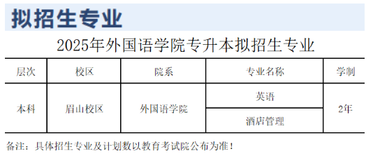 外国语学院开设英语、日语、酒店管理三个专业。培养应用型外语人才和中高级酒店管理人才,英语专业和酒店管理专业招收专升本学生。