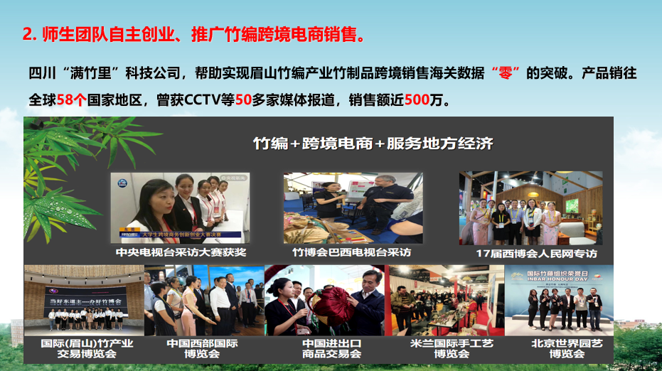 副教授,中国跨境电商工委会理事,跨境电商资源中心突出贡献专家,四川省三八红旗手、优秀教师。眉山市“国家外贸转型升级基地”、“国家跨境电商综合试验区”特聘顾问。获全国教科成果、省科研成果、文化传承一等奖;获第二届中国大学生跨境电商创新创业大赛特等奖;中国大学生互联网+创新创业大赛银奖等七项国家级双创大奖,三十余项省金银奖,专利两项。创办“满竹里”公司被评为“巾帼文明岗”,天府股交所上市,成功销往全球58个国家地区。四川唯一代表性典型入选“全国双创周”,展示“竹+跨境电商”促进乡村振兴成果,策划“竹与熊猫”惊艳亮相卡塔尔世界杯全球弘扬中国传统文化,CCTV人民网等百余家媒体争相报道。培养跨境人才,科技服务家乡,推动中国产业文化出海,让竹艺之花灿漫在世界里!