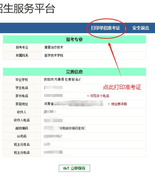 4.填充完个人信息后,点击保存,就可以打印准考证了.