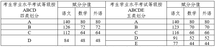 4. 能够提供普通高中学业水平考试成绩的考生文化素质考试成绩原则上采用普通高中学业水平考试成绩替代,按照语文、数学、外语三科的普通高中学业水平考试等级进行赋分,其中语文满分140分、数学满分80分、外语满分80分,具体赋分办法如下:
